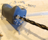 After some sanding and hole filling, I made two little holes underneath that would serve two purposes: by inserting a piece of plastic tube in each, I will have two stilts that will center the figure in the silicon mold, and once removed will serve me as holes in which to pour the epoxy resin.